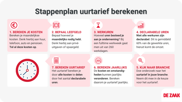 https://www.dezaak.nl/zzp/zo-bepaal-je-als-zzper-je-uurtarief-een-stappenplan (zie ook visual voorbeeld)